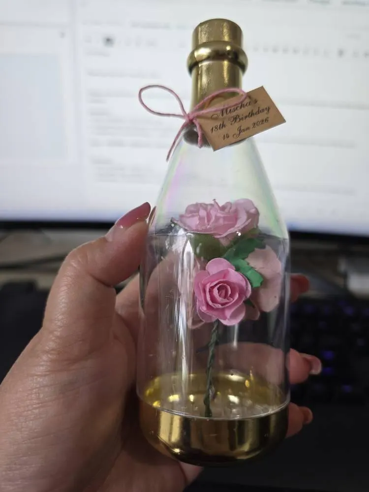 Materials: Plastic bottle, paper flowers, beads, ribbon, custom tag